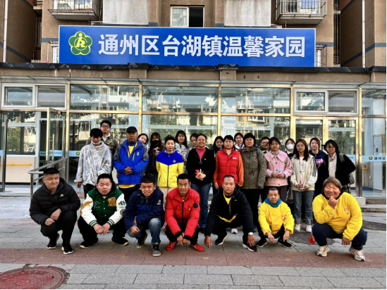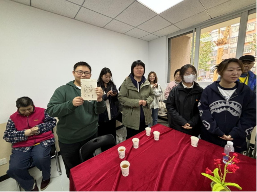 台湖镇温馨家园职康站的曹秀娥、张伟和赵新威三位老师热情接待了来访师生们,带领大家首先参观了学员们的工作和活动区域,有教室、食堂和文体活动区域。大家了解到该温馨家园刚刚成立,现有教师党员2人,其他工作人员2人。温馨家园职康站旨在服务辖区台湖镇的残障群体,为其提供日间托育和照护服务,是政府投资结合民营企业管理模式运作。职康站学员可以参加半日的文化课学习、文体活动,部分学员还能在这里学会做扭扭花、扎染等手工艺品制作技能,制作完成的工艺品通过销售渠道进行销售,所获收入反哺于温馨家园的运营。学生们充满好奇,带着年轻人的朝气,让长久以来居家生活的残疾学员们接触到来自av 的新朋友,感受到久违的来自伙伴的热情和温暖。
