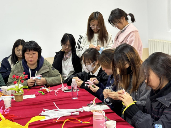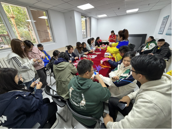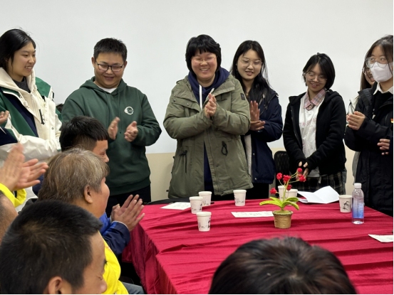 师生们跟残疾学员们一起开展了丰富多彩的互动交流活动,学员们表演了手语歌曲《把爱传出去》,学生们跟着学手语,融进了动听的旋律中;学生们集体合唱军歌,学员们则跟着节奏学习打拍子;然后学生们用制作好的英语图文卡片,开始了看图教英语的小游戏,你来比划我来猜,学员们很快猜出并学会了简单的英语单词,在学生们的带领下不断重复所学内容,阵阵欢笑声充满了整个房间。最后一个环节是手工制作扭扭花,学员们开始为师生们展示扭扭花制作过程,师生党员们也纷纷动手尝试学习,学会以后还手把手教授学员新的制花技巧,学员与师生们一起合作,做出了一个个颜色缤纷亮丽的扭扭花新作,大家纷纷亮晒谁的扭扭花作品最逼真最好看。这些形式活泼的交流活动让残疾学员们感受到了大学生们对他们的关爱和关怀,增强了学员的自信心。
