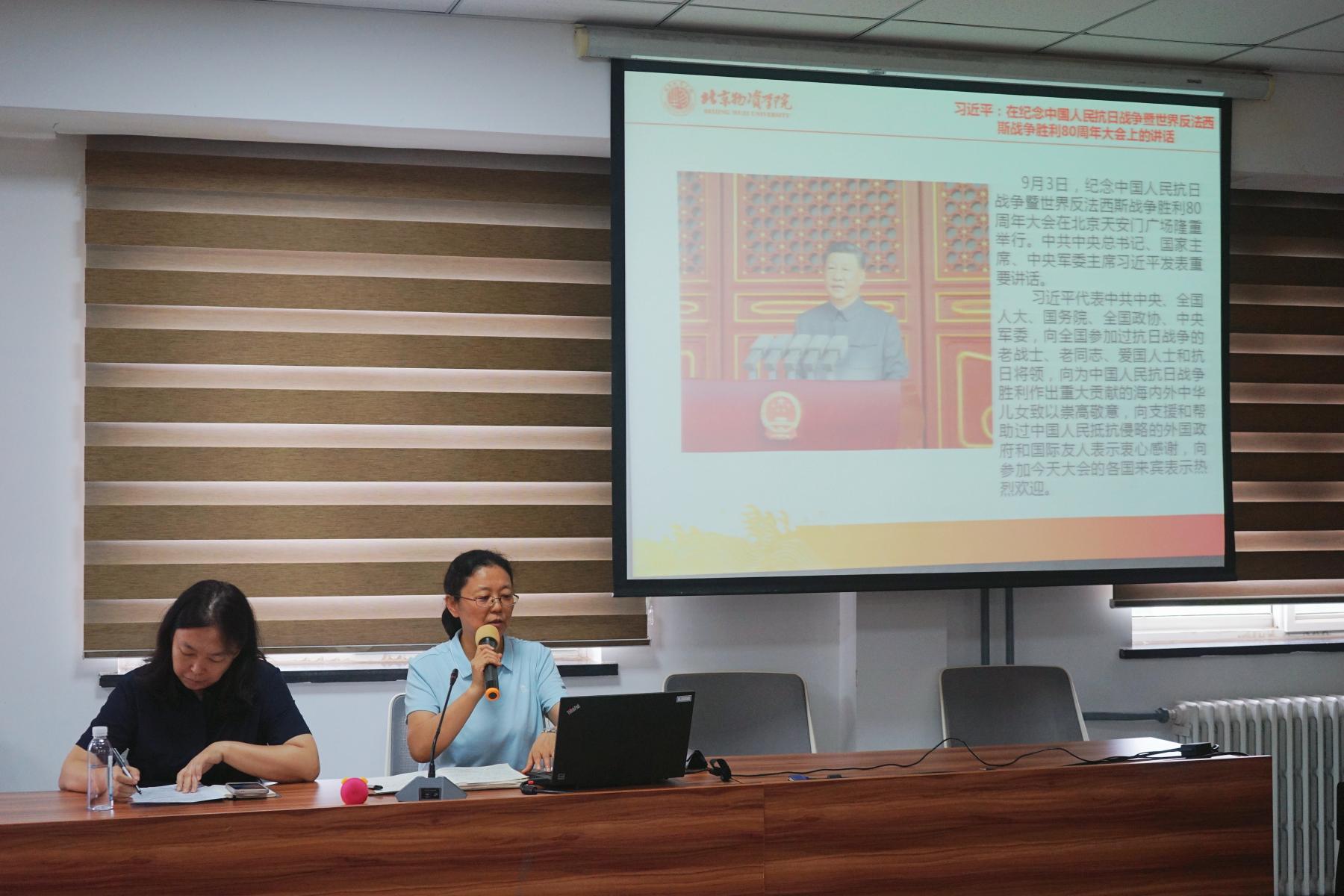 随后,会议对学院近期取得的多项科研就教学成果进行通报,在科研与项目申报方面,学院超额完成 “十四五” 目标任务:李兵老师成功获批国家社科基金青年项目,王震老师推进的教育部实践项目稳步开展;郝琳老师、唐棠老师的项目入选北京市高教学会2025教育教学改革示范案例,郝林老师申报的 “智链运河” 课题获选北京市教育国际交流协会2025年度课题。此外,王淑花院长凭借在课程思政领域的突出贡献,当选北京高校课程思政建设专家咨询委员会委员,为学院课程思政工作注入权威力量。在人才培养领域,学院顺利完成研究生推免工作,虽仅获1个推免名额,但从8月31日起便组织领导与骨干教师研讨推免细则,最终公示落地,保障了工作的公平与顺利。