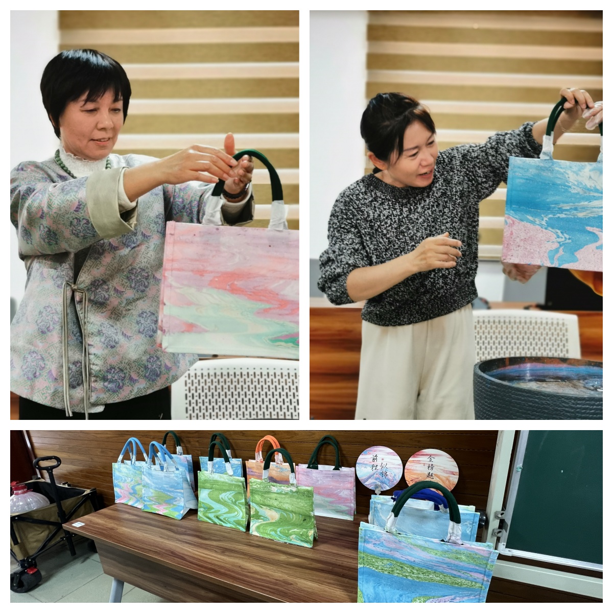 本次活动特邀非遗传承讲师王老师现场授课,系统讲解了漂漆技艺的历史渊源与工艺特色。王老师介绍,漂漆工艺已流传千余年,通过天然大漆在水面的自然流动形成独特纹理,每件作品都具有唯一性。老师首先为大家制作了两把手工漆扇,并送出了良好的祝愿。然后在王老师的悉心指导下,av 女教师们亲手完成了手工飘漆包的制作。从调色、滴漆到拨纹定型,每个环节都充满创作乐趣。当形态各异的漆纹在包面晕染开来时,现场不时响起阵阵赞叹和掌声。