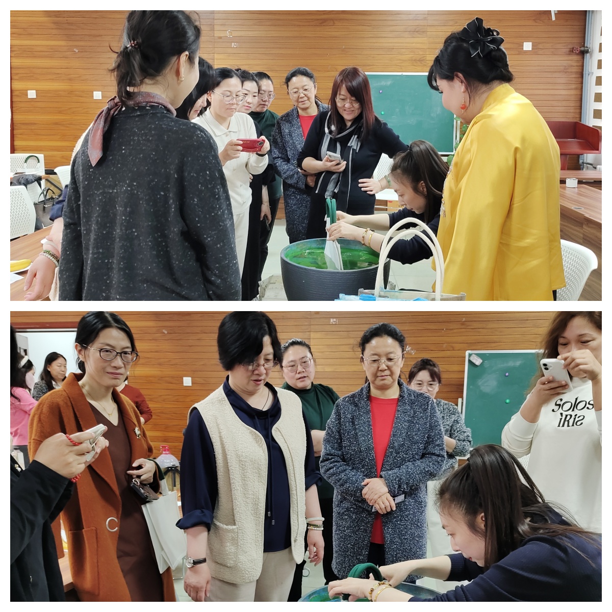 整场活动洋溢着艺术气息和欢声笑语,老师们互相交流创作心得,分享设计理念,气氛温馨热烈。完成作品后,大家纷纷合影留念,记录这一充满文化意义的节日时刻。"每一道工序都是与历史对话,这份节日礼物不仅是一次手作体验,更是一场文化寻根之旅",参与活动的老师们不禁感叹。活动不仅让老师们感受到非遗文化的深邃魅力,更以匠心精神激发女教职工的创新活力,展现新时代女性"自尊、自信、自立、自强"的精神风貌。