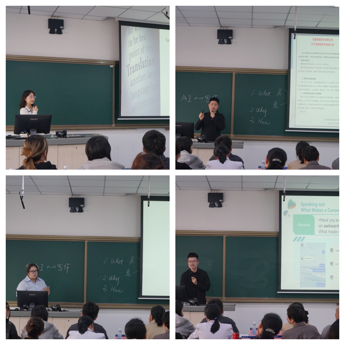 4位参赛教师在教学设计、学生互动、课程思政等方面展现出扎实的教学功底。蒋雨衡老师的翻译课程先从其定义和概念讲起,翻译是一种艺术,阐述了直译和意译区别,从“易,异,意,艺,怡”几个字的差异描述了翻译特征。李兵老师与时俱进,在写作课中AI赋能,聚焦如何使用AI模型生成不同公文,并让学生查找不足,从而提升学生的写作水平。王子慧老师讲授的是大学英语读写课程,通过略读和分析,帮助学生深入理解智能城市概念及其特征,并以独特方式帮助学生创建思维导图来理解智能城市技术,从而厘清文章结构。而最后出场的张一村老师则是针对大学一年级新生口语课,从分析口语特点导入话题,讲述了不同对话风格,还原了一个完整流畅的对话过程,并在跨文化交际的语境下将中国传统文化与对话相结合。