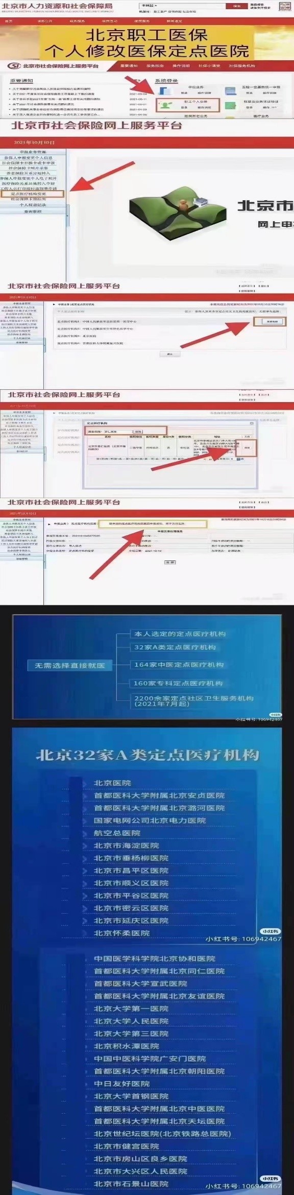 从2021年10月起,北京市城镇职工医疗保险参保人可自行通过社会保险网上服务平台,个人登录修改本人定点医院。办理时间为每月4日至月末最后一天,早六点到晚十点可登录修改。